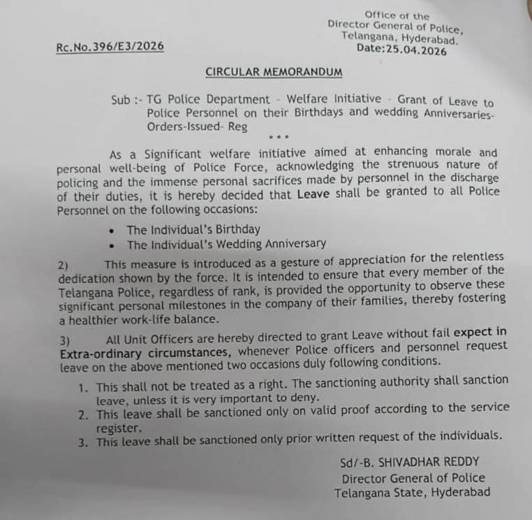 తెలంగాణ రాష్ట్ర పోలీసులు కు డీజీపీ బి. శివధర్ రెడ్డి శుభవార్త చెప్పారు. పోలీస్ సిబ్బంది సంక్షేమాన్ని దృష్టిలో ఉంచుకుని ఈ నూతన మార్గదర్శకాలను విడుదల చేశారు. హోదాతో నిమిత్తం లేకుండా కానిస్టేబుల్ నుండి ఉన్నతాధికారుల వరకు అందరికీ ఈ సెలవు వర్తిస్తుంది.